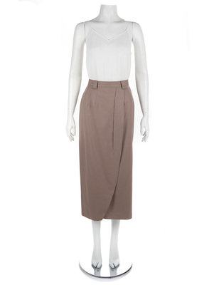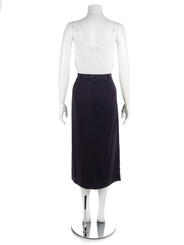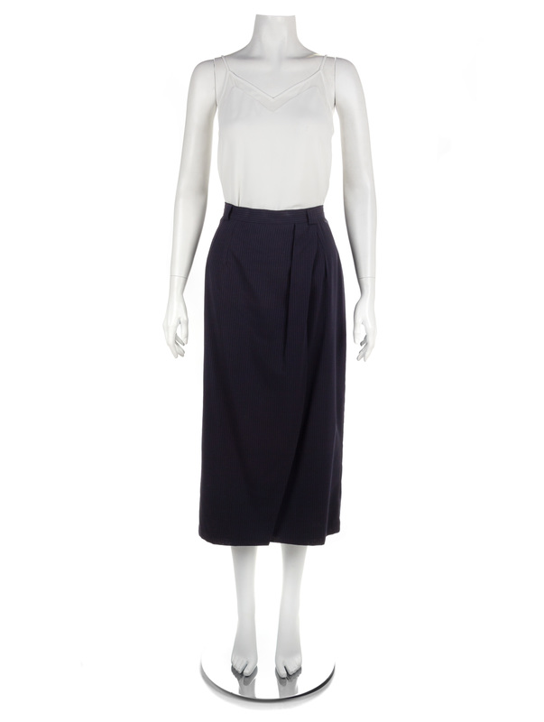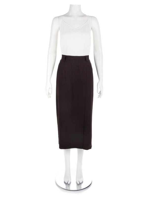 Each has a pencil silhouette, narrow waistband, and back zip closure; the khaki skirt and navy pinstripe skirt have faux-wrap cross-over front panel, and black pinstripe has a front side vent. No label, attributed to Oxxford Clothes.