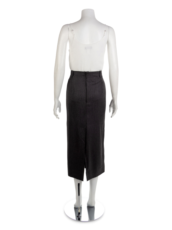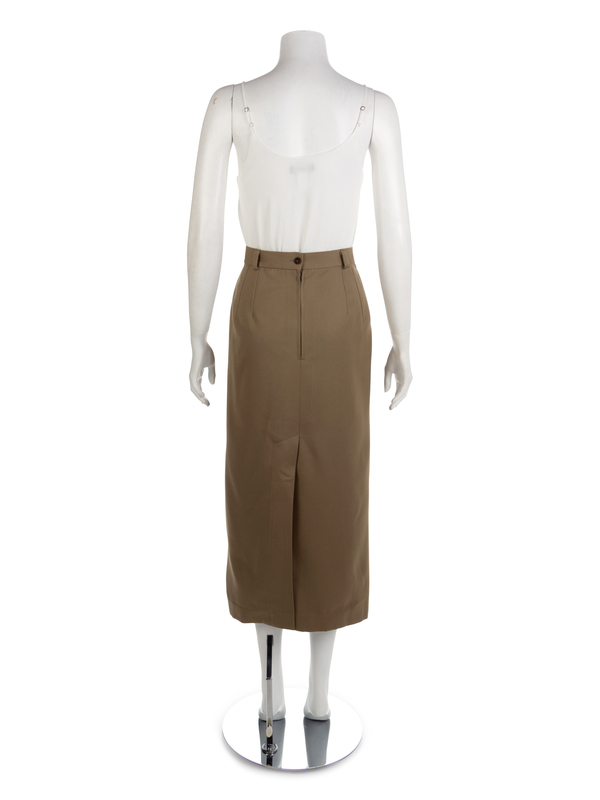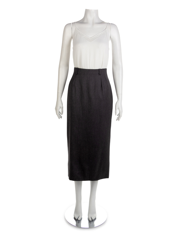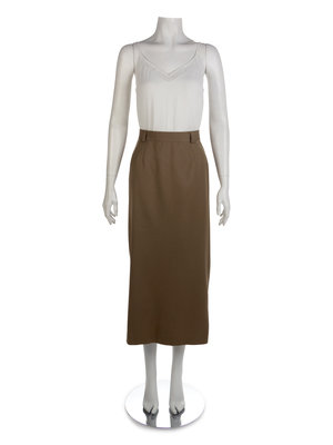 Both skirts are cut from a similar pattern with a long straight skirt with darts into the waistline with a center back zip closure. Center back vent. The fabric on both skirts is of a very good quality. No fiber content label. The lining of both skirts is woven with 'Oxford Clothes'.