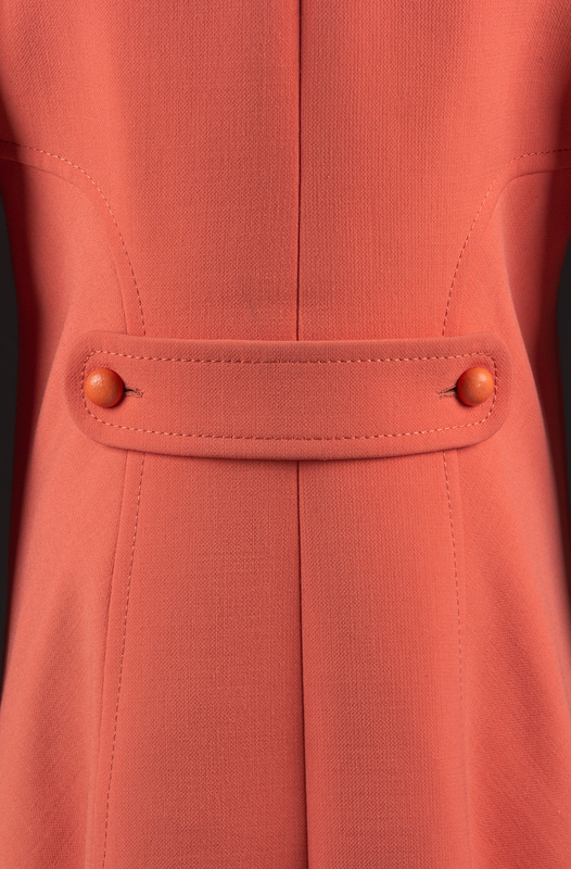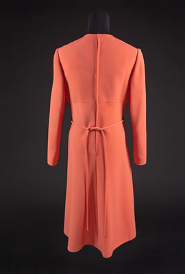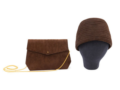 Ensemble consists of coat, dress, hat and bag. The main seams of the ensemble are sewn by machine while the inside, finishing stitches are done by hand. The coat and dress are made of the same peach fabric. The coat has wide fold down collar, long sleeves, flared hem and a center front button closure. The dress is similar in cut with a thin, self-fabric belt tied around the back with a center back zip. The brown suede bag has a quilted flat with the word 'Dior' in goldtone and a gold chain strap. The hat is of brown suede with a top-stitched design.