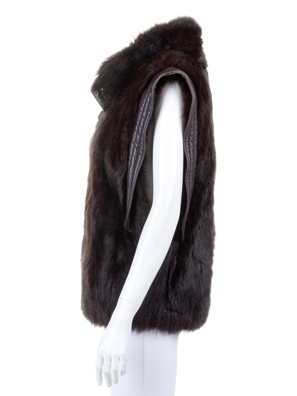 Brown fur and leather jacket/vest with stand collar, front pockets, and a center front snap closure. Sleeves are missing.