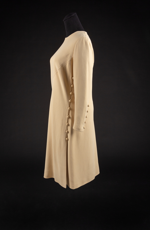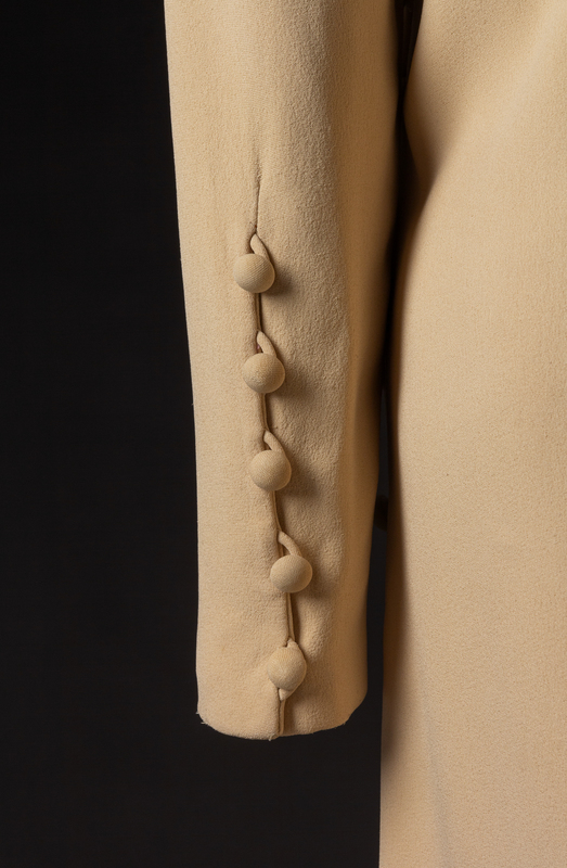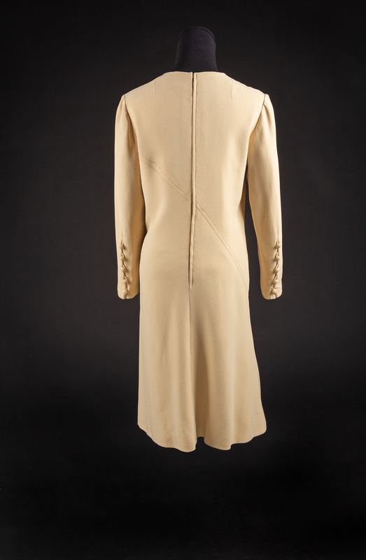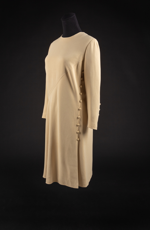 Cream silk crepe dress with scoop neckline, long sleeves and a button detail on each sleeve hem and down the left side seam. The overall dress is cut in horizontal lines with top-stitched seams. The dress closes down the center back with a zip.