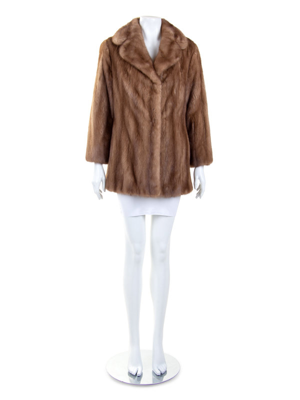Tan mink fur coat with notched lapel, long sleeves and a center front hook and eye closure.