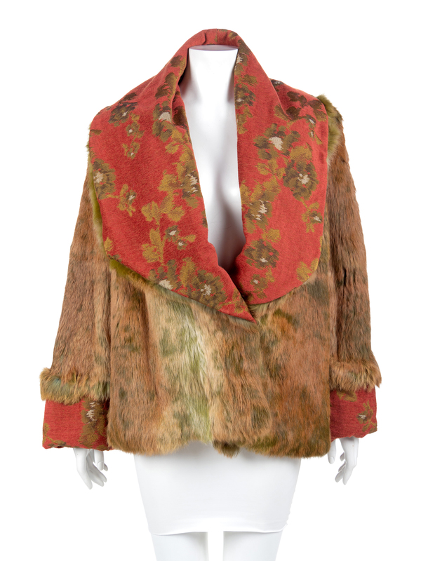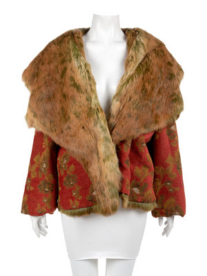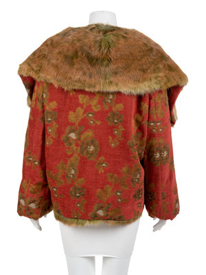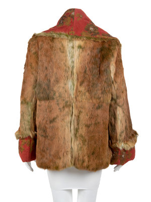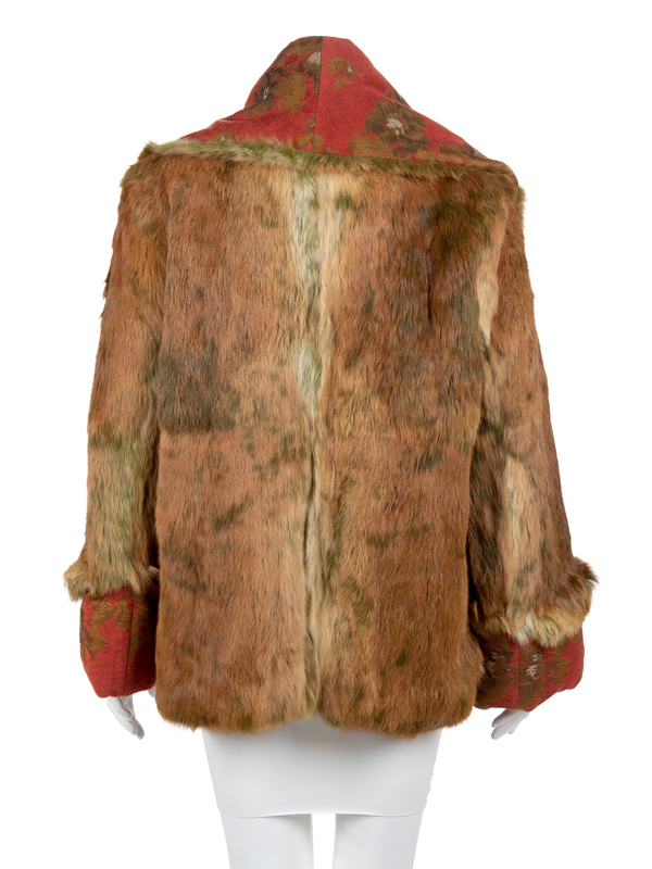 Red with earth toned floral tapestry reversible jacket lined with multi-hued rabbit fur exaggerated shawl collar, straight sleeves, and front hook and eye closure.