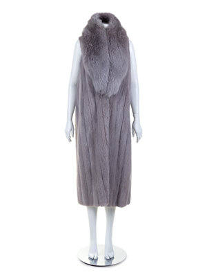 Silver polyester sateen puffed trench coat with full sleeves, front pockets, and belt. Sable lining and Fox fur collar are detachable with button fasteners. Gray leather trim on shoulder flaps. Silver soutache detail on shoulder flaps, front pocket welts, and sleeve cuffs. White and gray rabbit fur gloves with Thinsulate lining.