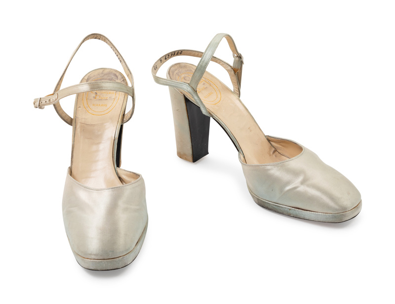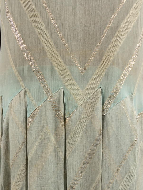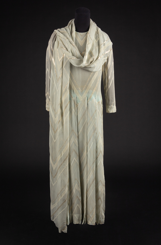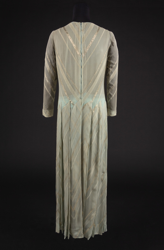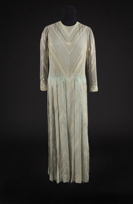 Ensemble consists of dress, scarf, necklace and shoes. Main fabric is a light blue sheer fabric woven with a gold lame stripe. The dress has a scoop neckline, long sleeves, straigh bodice and long knife pleat skirt. The matching scarf is long and rectangular. The is lined and closes down the center back. Necklace is a square goldtone chain with clusters of rhinestones.