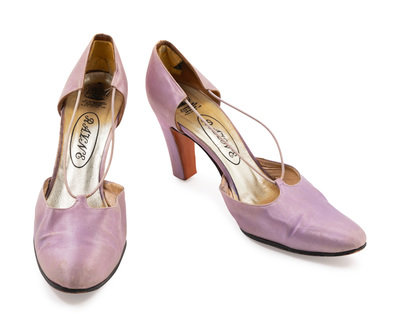 Mauve silk crepe dress made of multiple layers all stitched to a boned inner bodice of cream silk. The dress has thin shoulder straps and closes down the center back. A poncho of self-fabric closes at the center back with a button (missing) and loop. The matching shoes are made of a purple satin.