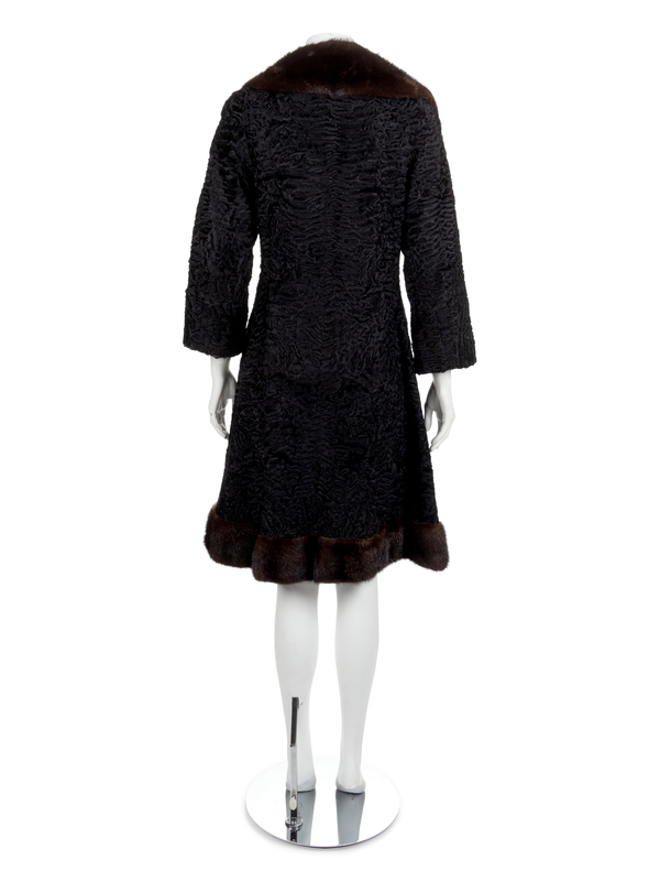 Black lambswool coat trimmed with brown mink collar and hem. The coat is made with a notched lapel, long sleeves and a center front hooks and rings closure. Black lining is woven with the word 'Schiaparelli'.