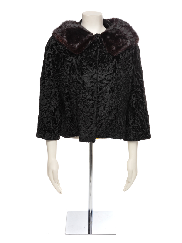 Black lambswool coat trimmed with a mink collar, long sleeves and a center front closure. Coat is lined in black fabric.