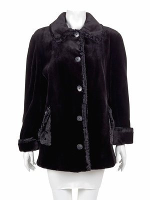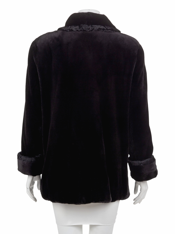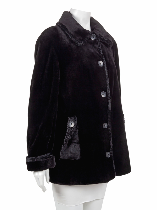 Black fur coat trimmed in black lamb shearling, roll collar, straight sleeves with cuffs, front button closure, and front pockets with button detail.