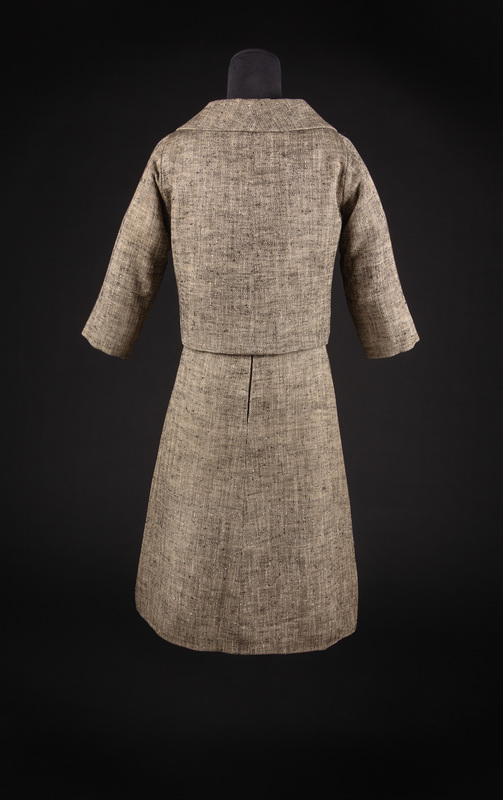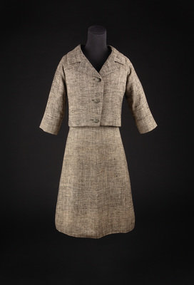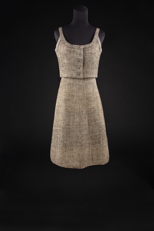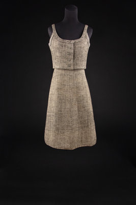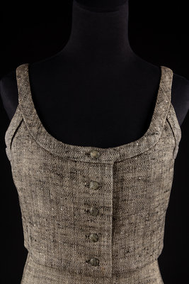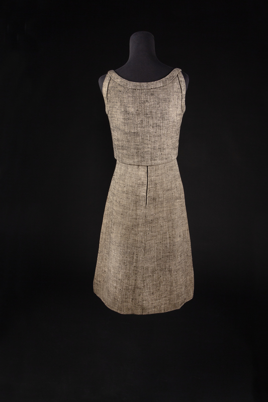 Jacket, bodice and skirt of black and white herringbone fabric. The main seams of the ensemble are sewn by machine while the inside, finishing stitches are done by hand. Jacket has a notched collar with 3/4-length sleeves and a center front three-button closure. The sleeveless bodice has a wide scoop neckline and closes down the center front with five buttons. The flared skirt is high-waisted and is attached to a sleeveless black silk bodice.