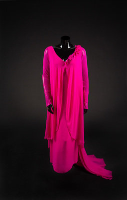 Dress, bag, necklace and earrings, 1989. Dress designed by Paul Zastupnevitch, made by Western Costume Company in Los Angeles.