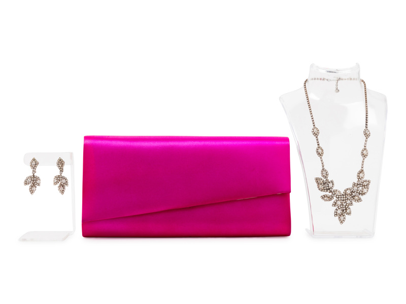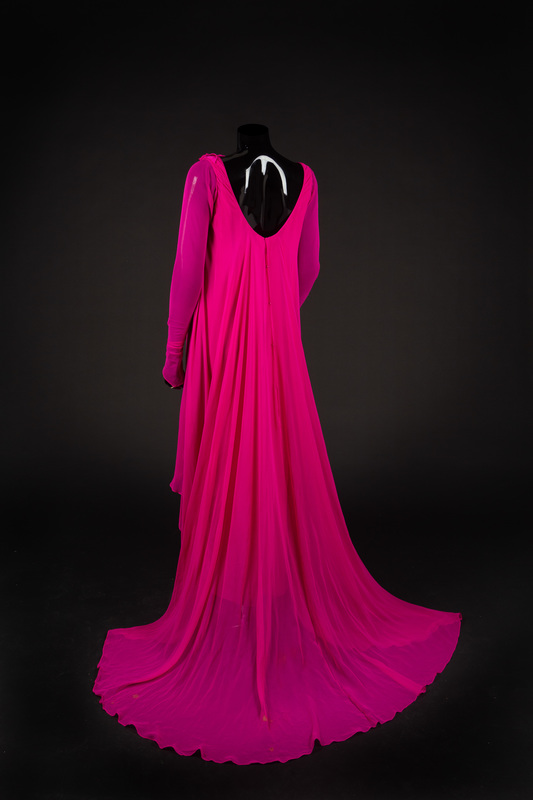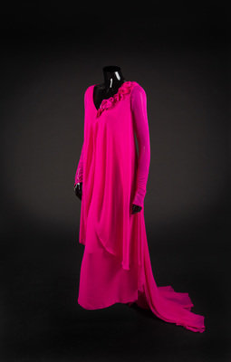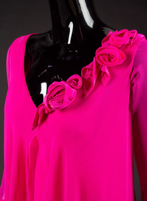 Rose silk crepe dress made of multiple layers of the same material with a wide, sweeping hem and a single, see-through layer for the sleeves. Rose fabric roses are sewn to the left neckline. The dress closes down the center back. The bag is finished with the same material as the dress and is with a single flap and chain strap. A silvertone, rhinestone and faux pearl necklace and earrings are included with this ensemble.