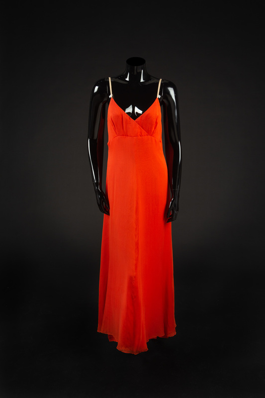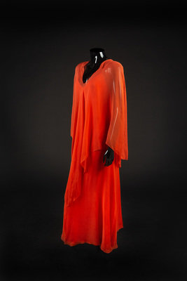 Orange silk crepe dress made of multiple layers with a cross-over bodice, wide sweeping hem and matching poncho.