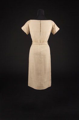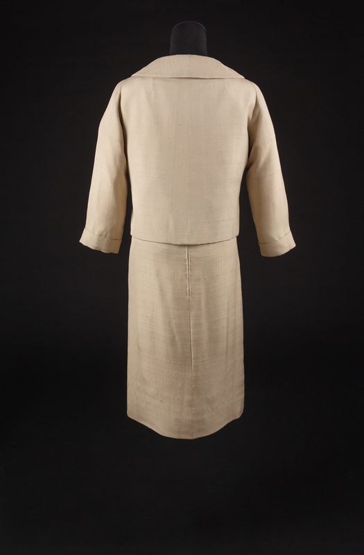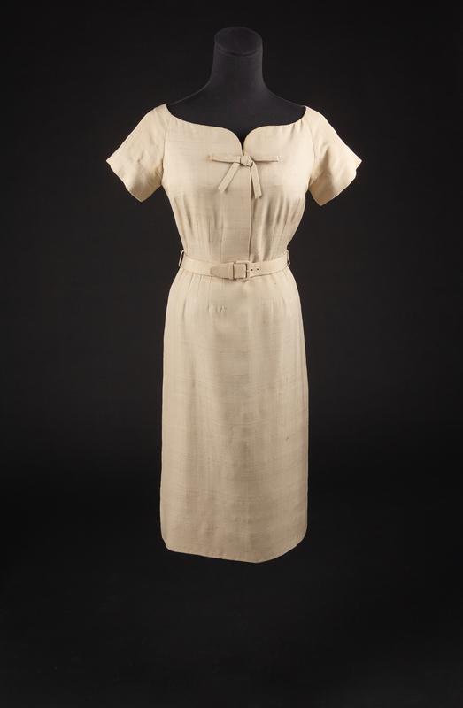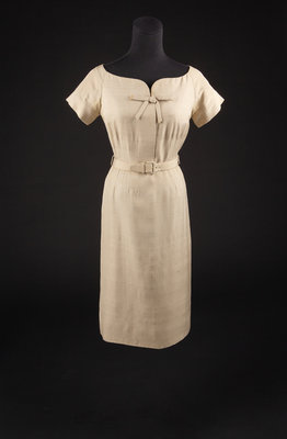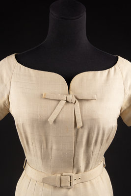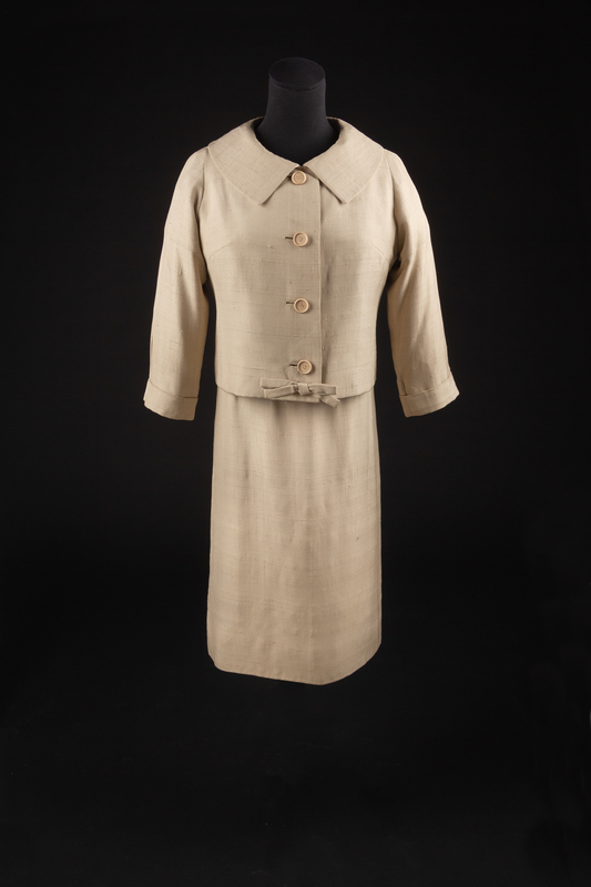 The ensemble consists of a dress, jacket and two belts. The main items are made of cream raw silk. The dress has a stylized neckline ending with a point and bow at the center front. The dress has short sleeves with the fullness in the bodice and skirt controlled by numerous vertical darts that extend away from the waistline. The jacket has a wide collar and a center front button closure with a decorative self-fabric bow at the hem. There are two belts that come with this ensmeble. The first is self fabric and the second is cream leather.