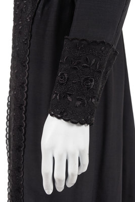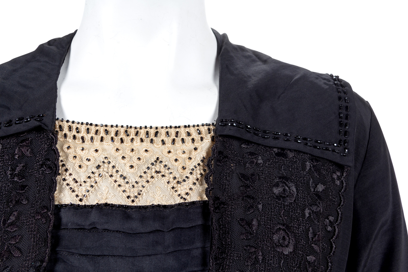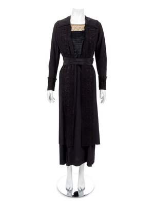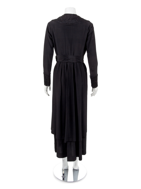 Black silk dress embroidered with black silk thread with a squared neckline, long sleeves and a black satin belt. The dress closes down the center front with a complex series of hooks and eyes and snaps. The design of the front of the dress gives the impression that this one piece is actually a coat over a dress over a blouse when it is one piece with a center front closure. There are 21 snaps, hooks and eyes down the center front closure.
