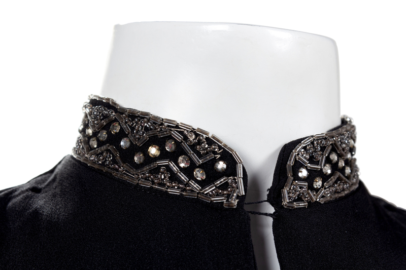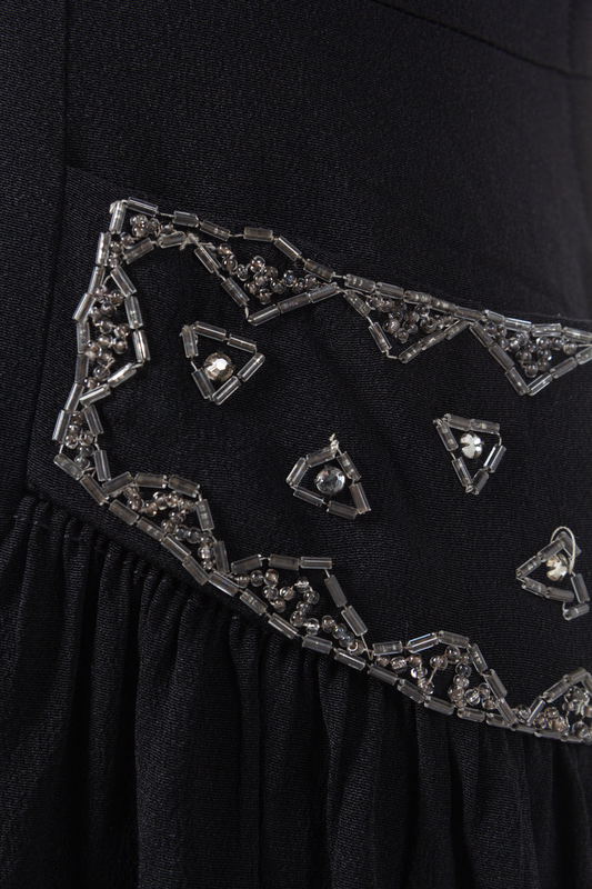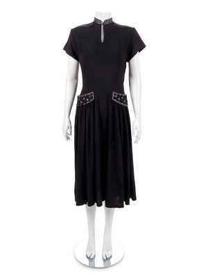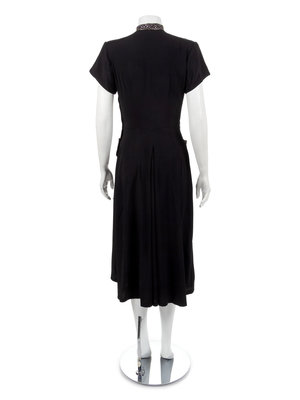 The first is a 1940s black silk crepe dress with glass beads and rhinestone embellishments on collar and hip pockets. The dress has a full skirt that is gathered at the hips and a left side zipper closure.