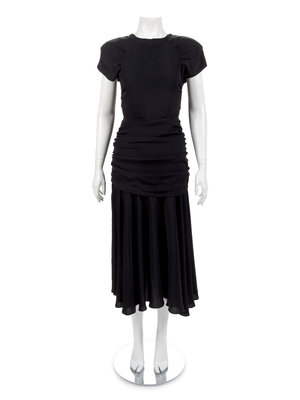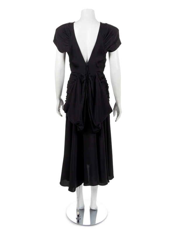 The second is a 1980s black rayon crepe dress with front scoop neck, raglan sleeves gathered into front bodice, gathers and draping at the hips, a deep V-neckline at the back with fabric bustle, and center back zipper closure.