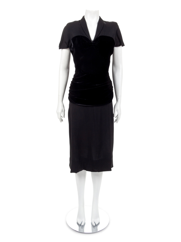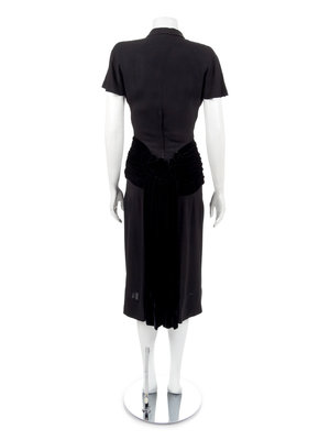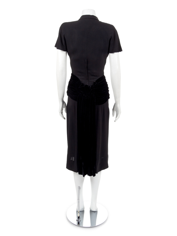 The second dress is made of black crepe and velvet with a fold-down collar, short cap sleeves and a straight skirt to just below the knee. The front of the bodice and hips section are trimmed with black velvet that is gathered at the side hips and draped into a panel that hangs freely down the center back. The dress closes down the center back with a zip.