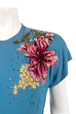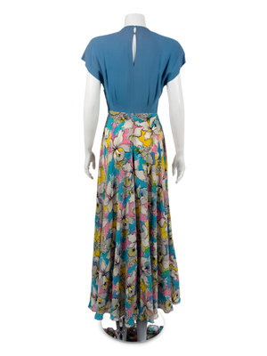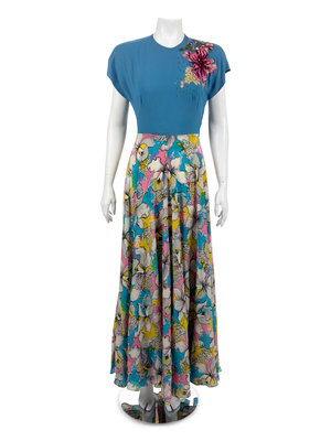 The first dress is made of a blue crepe bodice with a large beaded and sequined flower over the left shoulder. A floor-length floral printed skirt is sewn into a fitted waistline, which closes at the side with a zip. The back neckline closes with two hooks and eyes.
