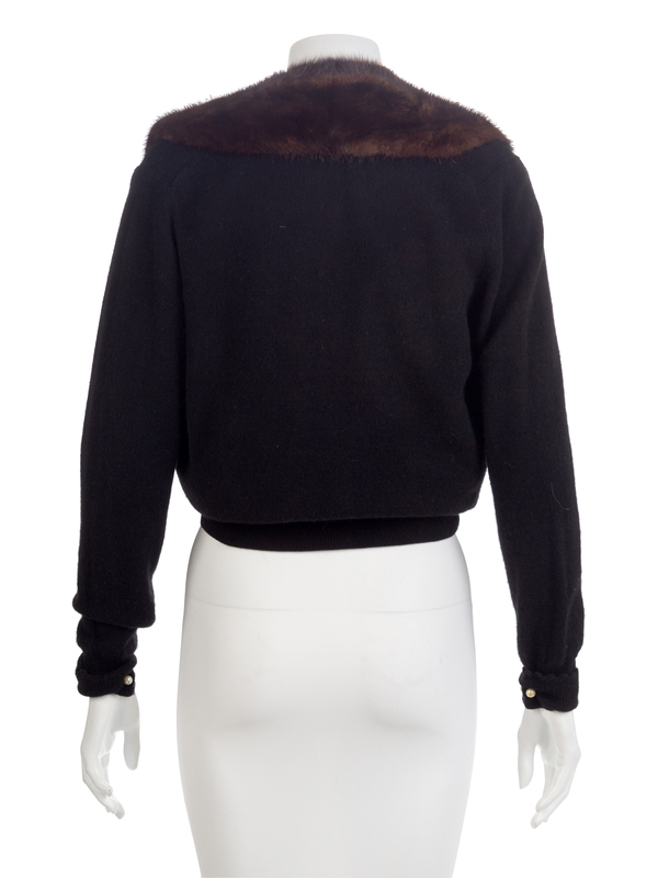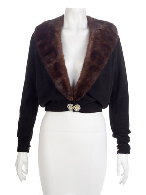 Black cashmere cardigan with detachable brown mink collar. Closed at the center front with a silvertone, faux pearl and rhinestone buckle. Two faux pearls at the hem of each sleeve.
