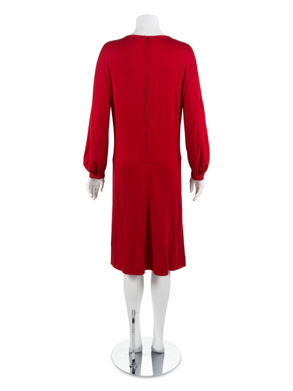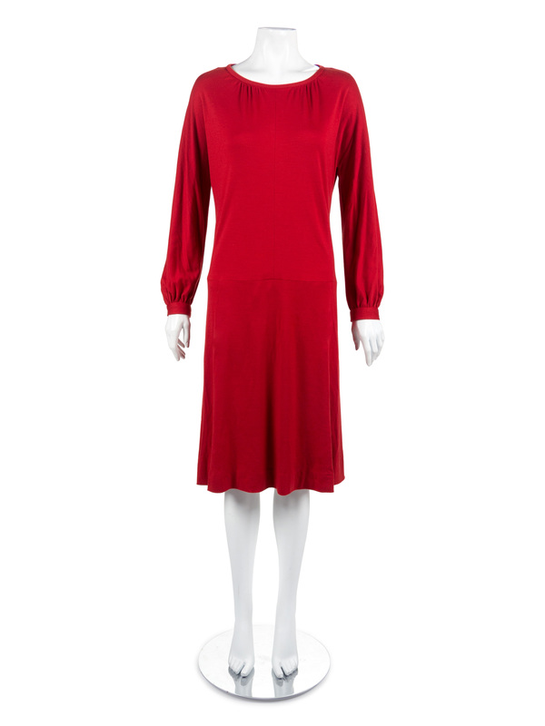 Red wool knit dress with scoop neckline, long sleeves that gather into a cuff and a center back zip closure. The sleeves and the top of the front and back of the dress are cut in one piece.