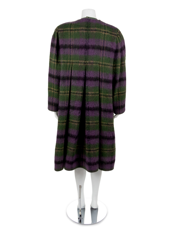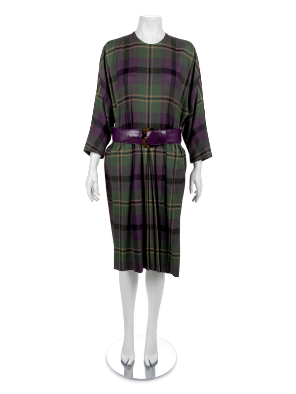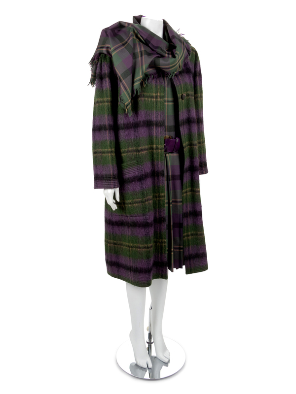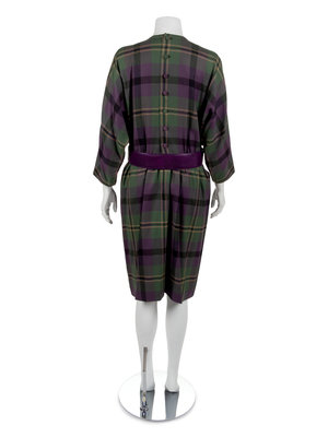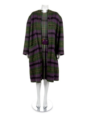 Ensemble Consists of Coat, Dress, Scarf, and Belt. Purple and Green plaid wool blend swing coat with jewel neckline, straight sleeves, front patch pockets, and front button closure. Dress in matching purple and green plaid wool with scoop neck, combined bodice and 3/4 sleeve, pleated and gathered straight skirt, and back button and zipper closure. Scarf in matching purple and green plaid wool. Belt is purple embossed leather in snake skin with faux tortoise shell buckle.