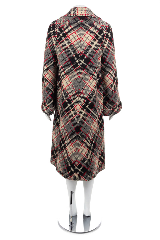 With flared raglan sleeves cuffed at the wrist, front button closure with black buttons, slant pockets, and black lining.