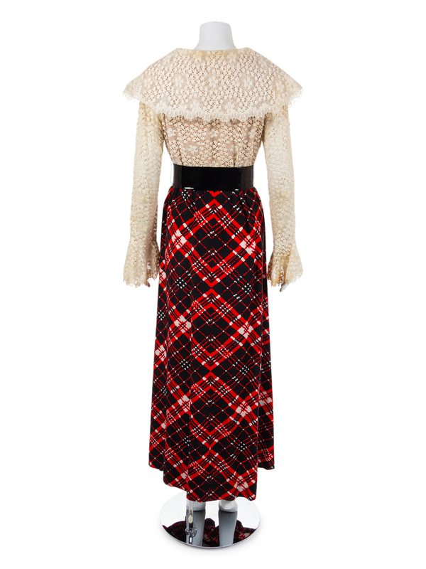 Dress with lace bodice, wide collar and flared sleeves. The long skirt is pleated into the wiastline, which is finished with a separate black patent belt with large buckle. The dress closes down the center back with a zip.
