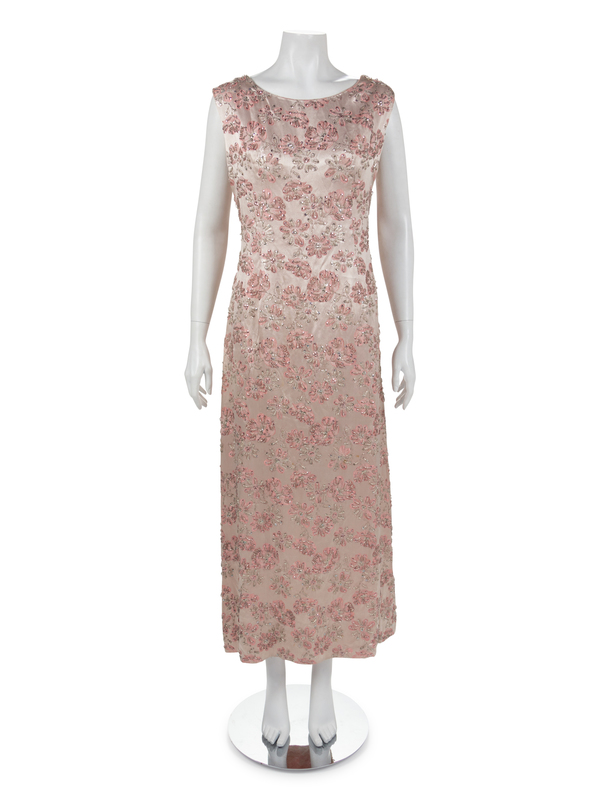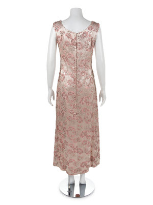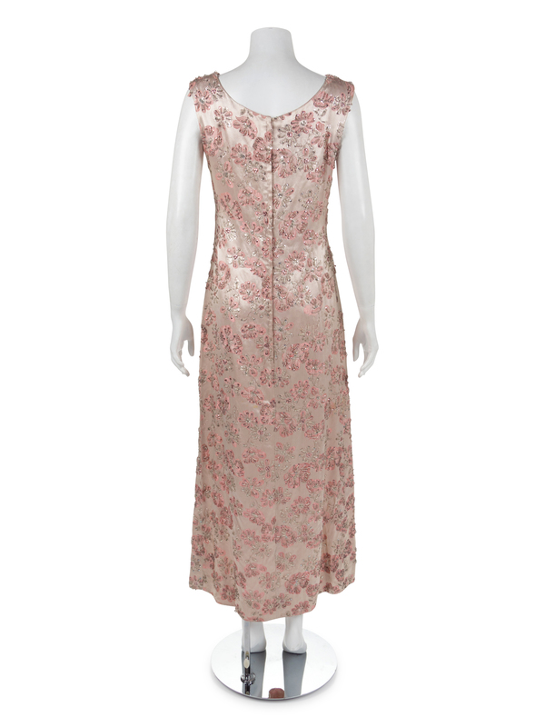 Sleeveless long pink satin sheet dress with scoop neckline and center back zip. The dress is woven with pink and silver flowers and embroidered with sequins and clear sead beads.
