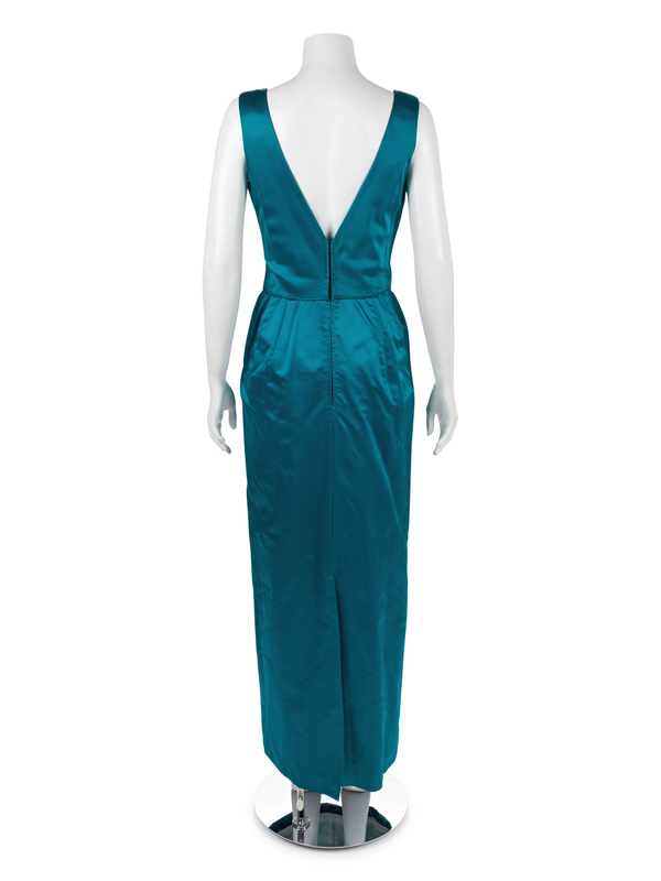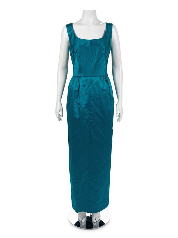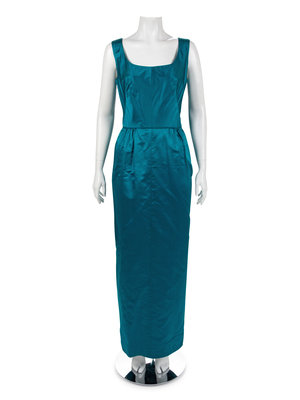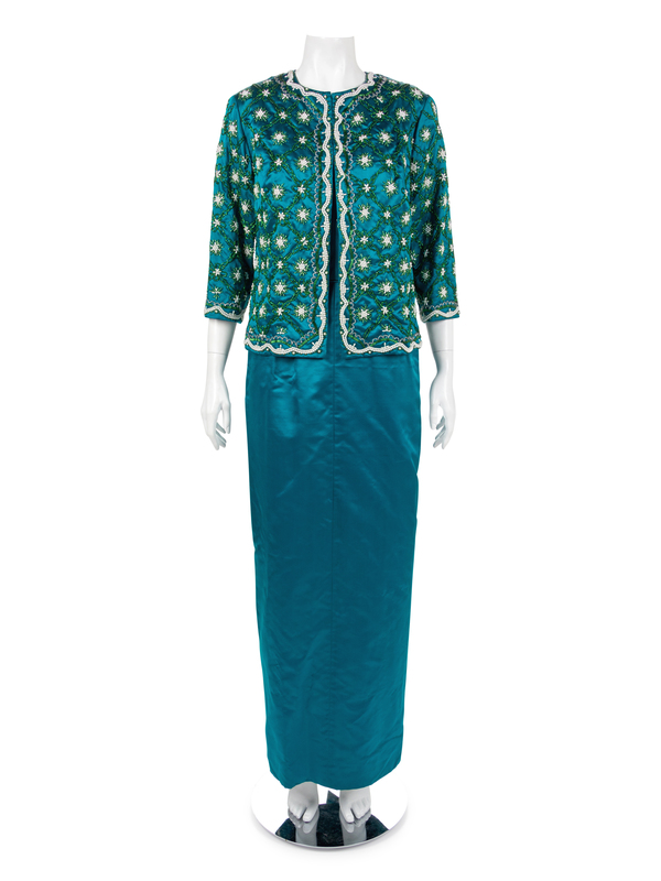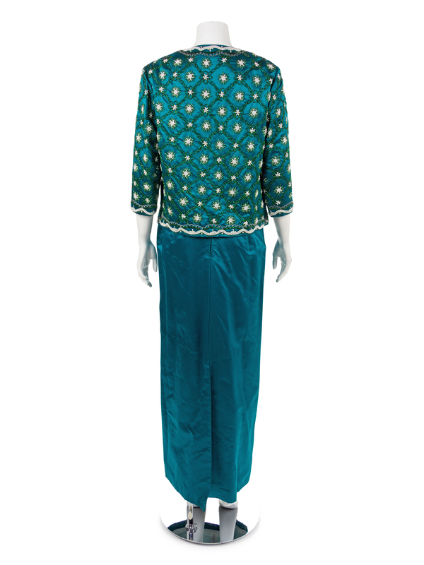 Emerald green floor-length evening dress with fitted waist, straight skirt with back vent, and back zip closure, custom made in Hong Kong in 1964. Together with matching jacket with green bead and faux pearl embellishment, cropped sleeves, and hook and eye closure.