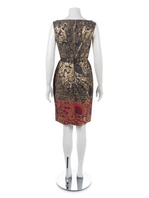 The first dress is sleeveless and made of a black and gold lame weave with a wide neckline, and a assymetircal skirt. The dress clsoes down the center back with a zip. Label: Pattullo-JoCopeland