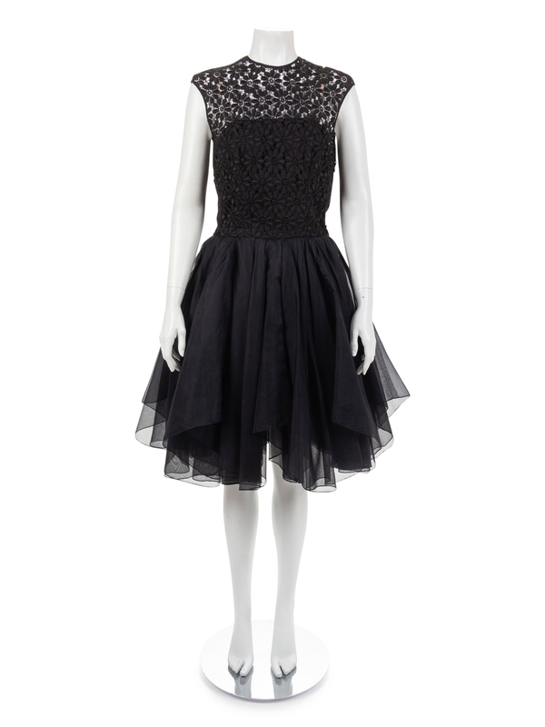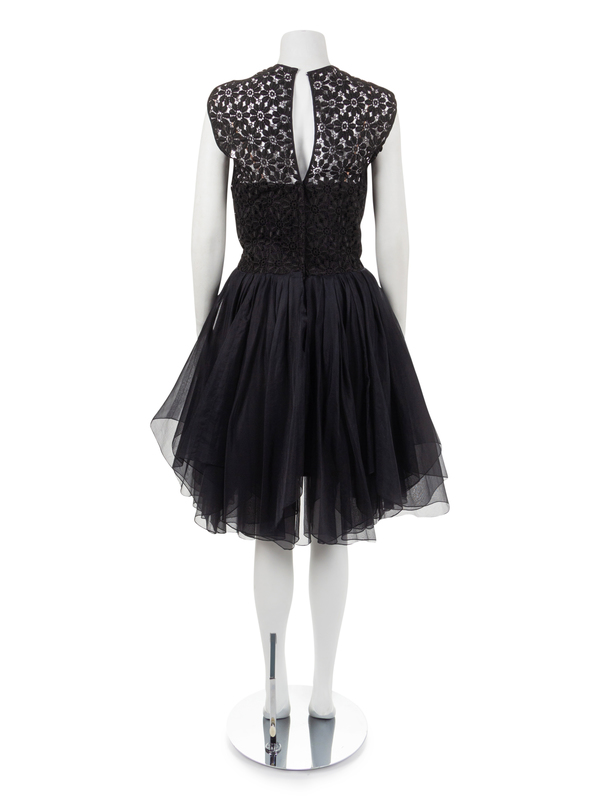 The second dress is made of a black sheer material in the skirt and a bodice of lace. The skirt is very full with a scalloped hem. The dress closes down the center back with a zip.