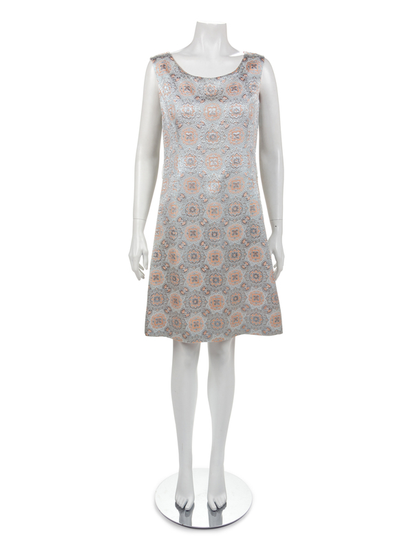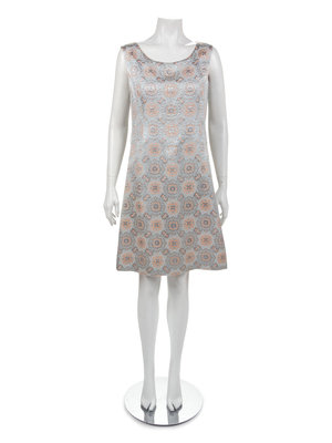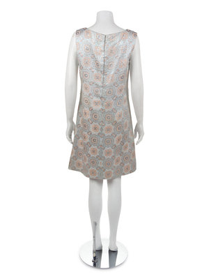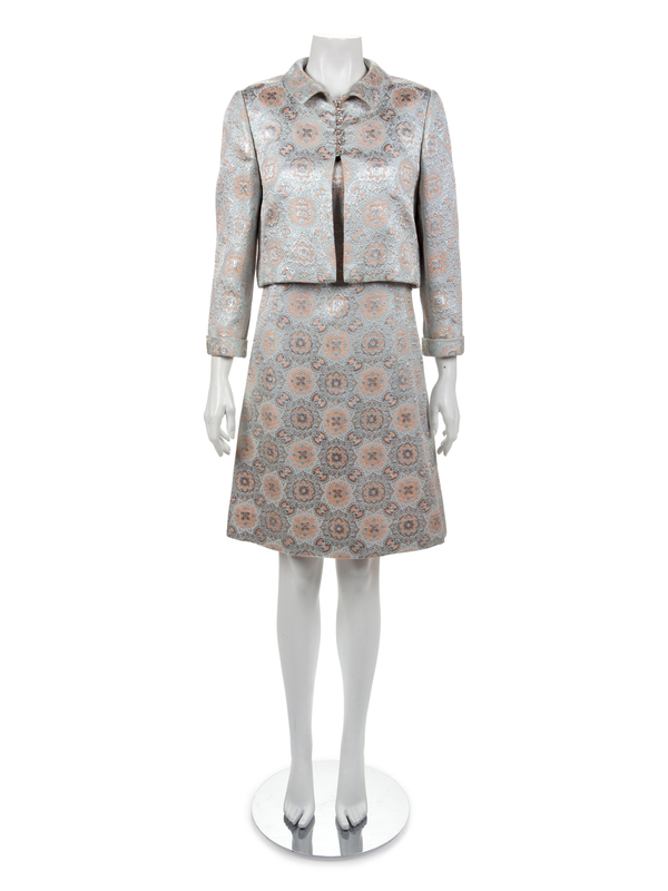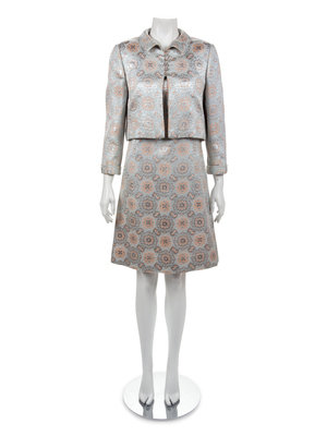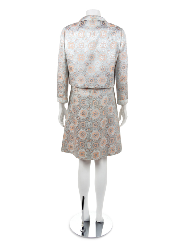 The third is a ensemble of jacket, dress and belt made of light blue and peach satin brocade woven with a blue mylar strip. The dress has a scoop neckline, no sleeves and a center back zip. Jacket has a fold down collar, long cuffed sleeves and a center front button closure near the neckline only. The self-fabric belt closes with a large rhinestone buckle.