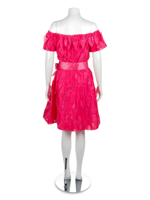 The first is a short dress of pink sheer and jacquard fabric with self-fabric leaf applique studded with crystals. The dress is off-the-shoudler with short sleeves and a pink satin bow wrapped around the waistline.
