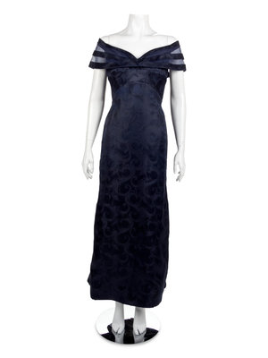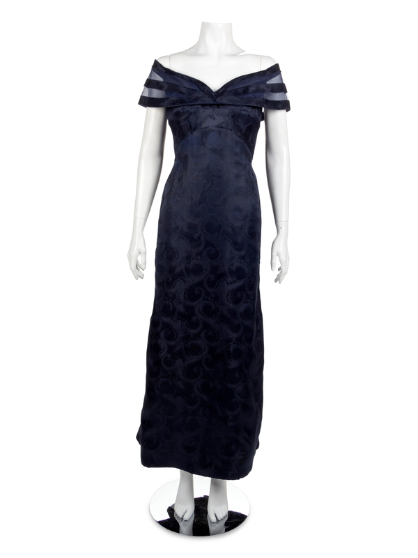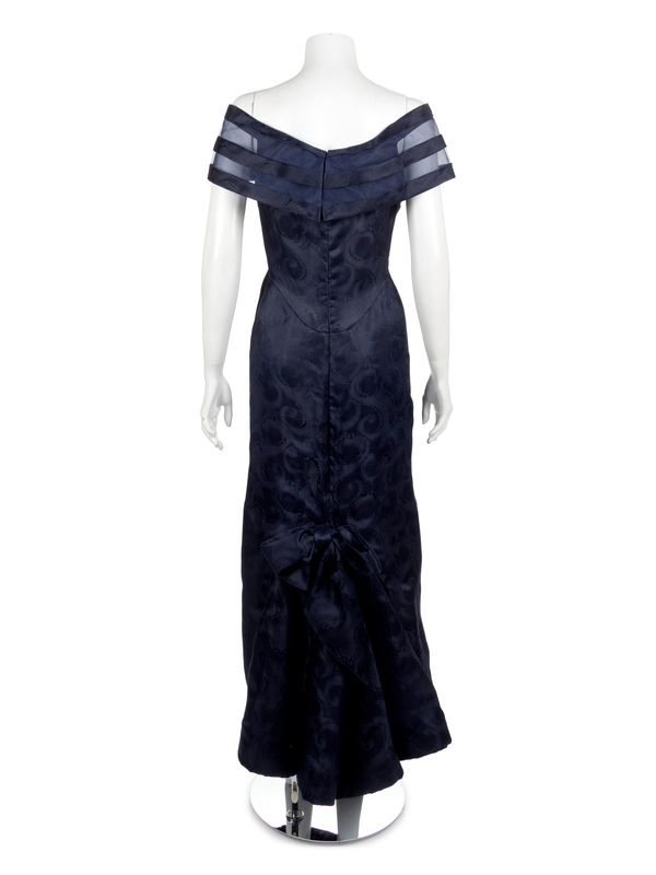 The second is a long dark blue silk jacquard dress with a shoulder capelet of self-fabric and blue horsehair stripes. The dress flares at the hemline with a bow at the back knee and closes down the center back.