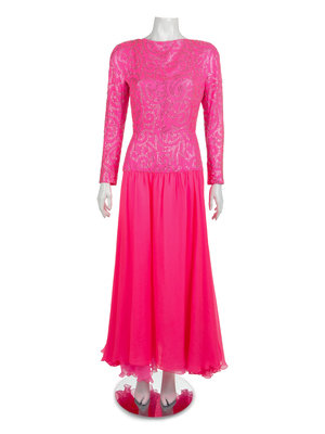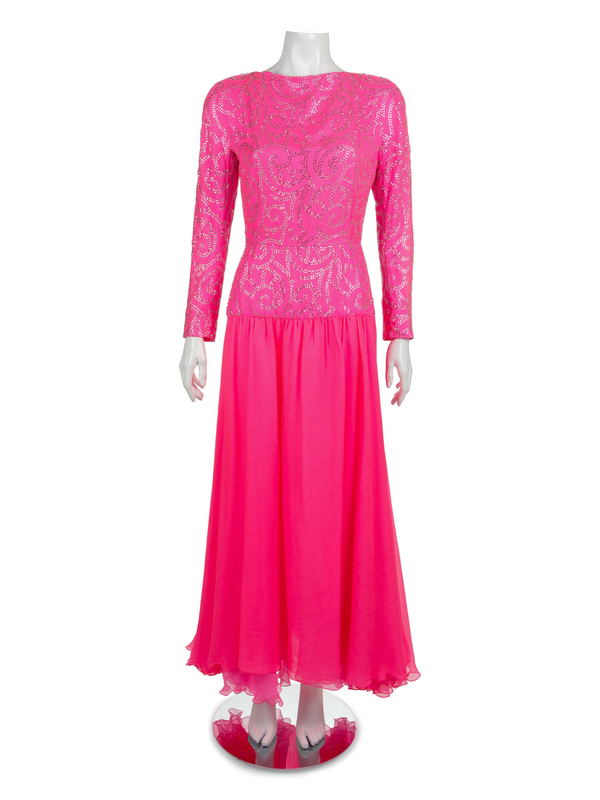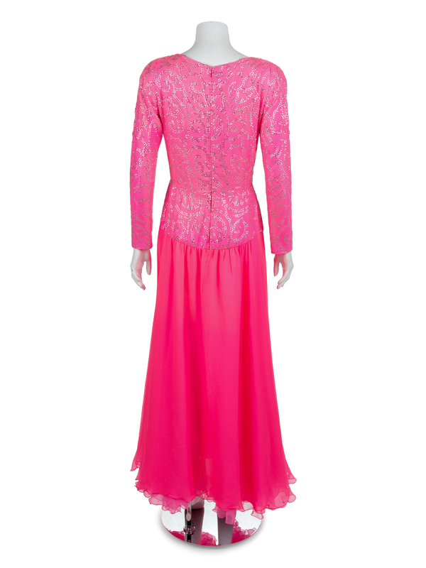 The third dress is a long pink dress with a bodice and hips embellished with adhered small crystals. The dress is cut with a wide scoop neckline, long sleeves and a full skirt of sheer pink crepe. The dress closes down the center back with a zip.