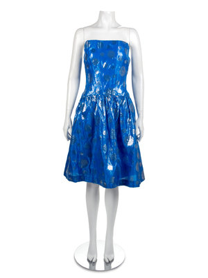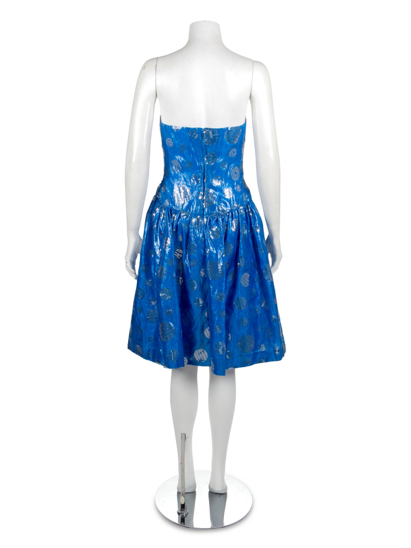 The fourth dress is of blue synthetic fabric with a mylar thread and with circles of silver strips adhered to the surface. The dress is strapless with a boned inner bodice and with a full skirt gathered into the waistline. The dress closes down the center back with a zip.
