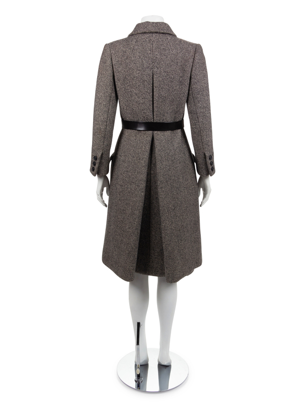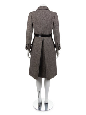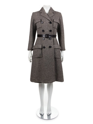 Black and white wool coat and skirt. The coat has a notched lapel, long sleeves, double breasted button closure, black belt and two sets of flapped patch pockets. The matching a-line skirt has a slip pocket over each hip and closes at the center back with a double zip (one down each princess line).