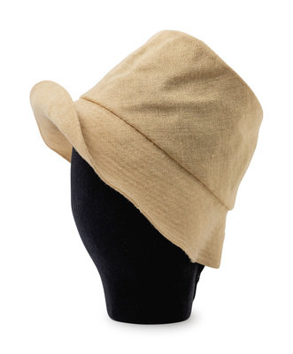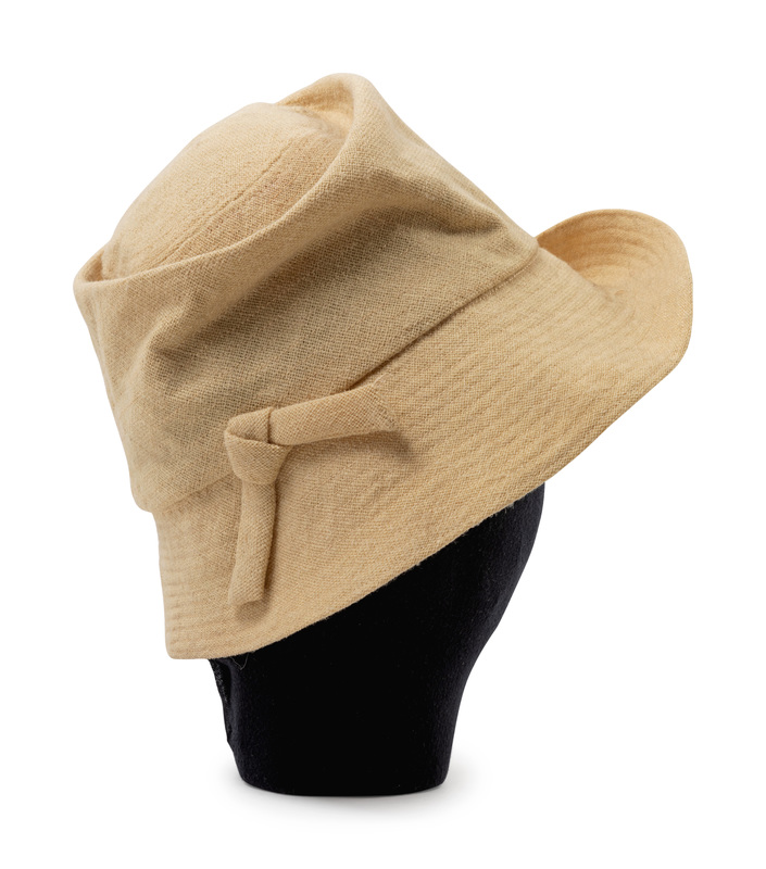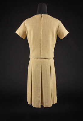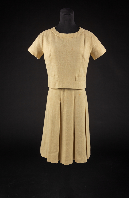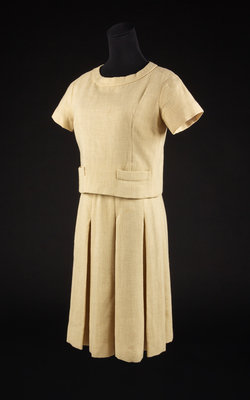 Ensemble consisting of dress, bodice, hat and belt in yellow wool. The main seams of the ensemble are sewn by machine while the inside, finishing stitches are done by hand. Bodice is made with a wide scoop neck, cap sleeves, a pocket over each hip and weights sewn into the hem. The dress is made with a heavily pleated skirt attached to a yellow silk bodice. The belt is made of a dark yellow suede. The hat is made of the same fabric as the bodice and skirt and has a curved brim.