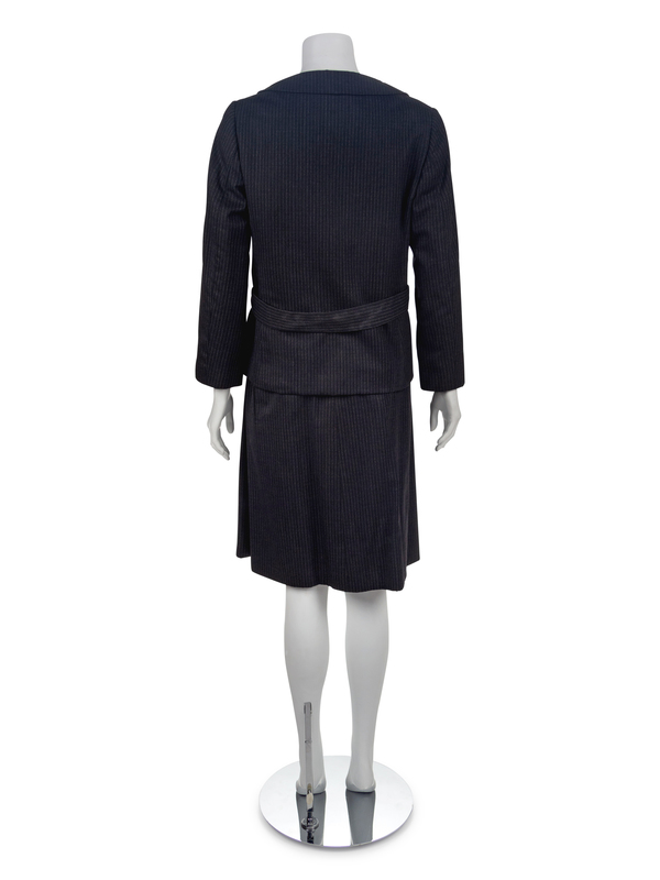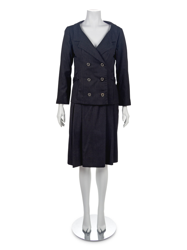 Ensemble consists of jacket and skirt. Dark gray with light gray wool pinstripe with a double-breasted jacket with metal buttons, hidden front seam pockets, and back belt. Matching gray pinstripe a-line skirt with front pleating, narrow waistband, side seam pockets, and side zip closure.
