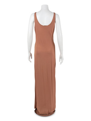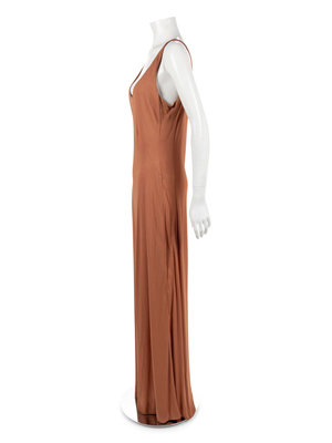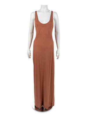 Floor-length dress with narrow straps, waist darts, and long, slim silhouette that flares out at hem. Pullover style with no closure.