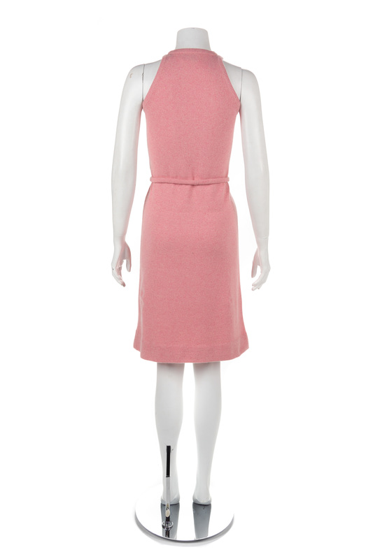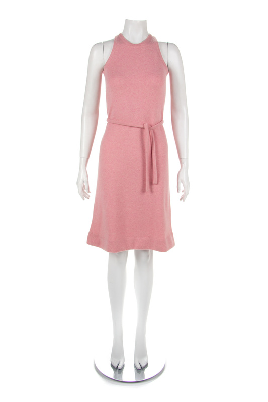 Pink cashmere dress and belt. The sleeveless dress has a crew neckline and fitted torso extending to an a-line hem. Self-fabric belt