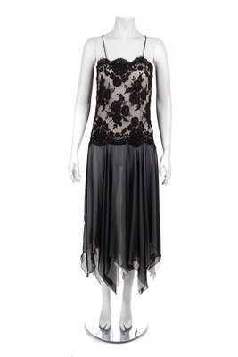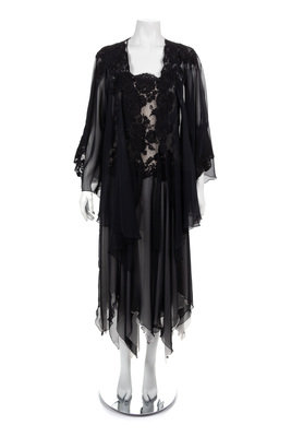 Second Ensemble consists of dress and jacket. Dress is made of a black net and lace bodice with a double-layer skirt of black on the exterior and a white layer lining. The jacket is made of sheer black fabric, trimmed with black lace and closes at the center front with a black ribbon.