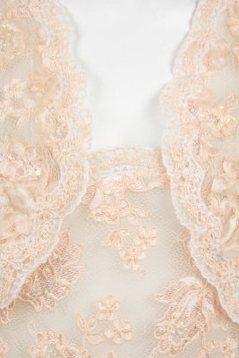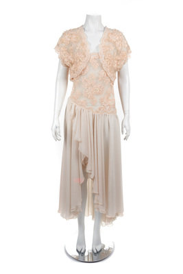 First Ensemble consists of dress and jacket. Dress is made of a pink lace bodice trimmed with small pearls and is attached to a two-layers skirt of sheer fabric. The jacket is made of the same material as the bodice of the dress, but is further embellished with sequins and pink sheer ribbon.