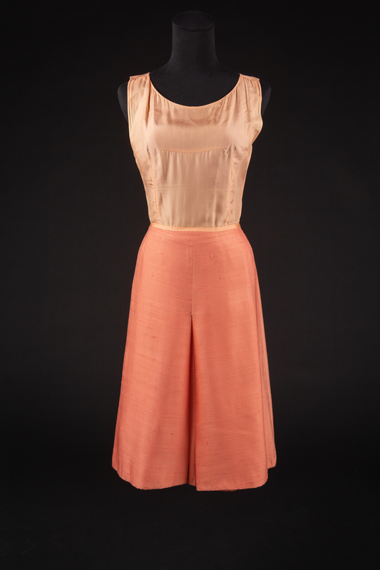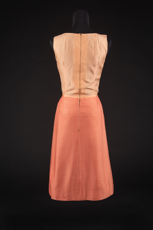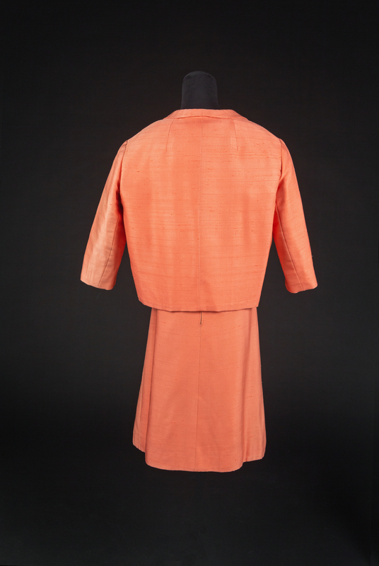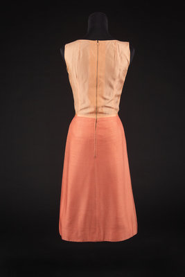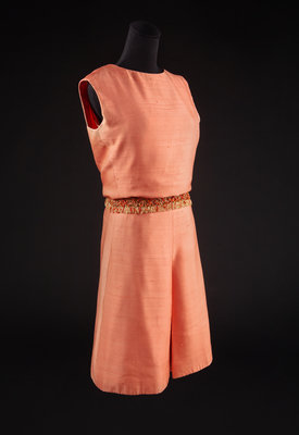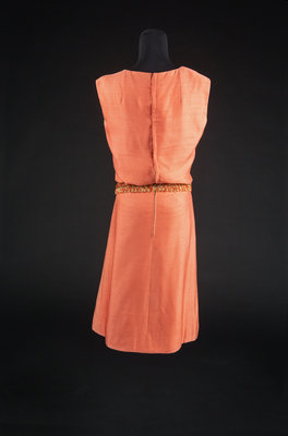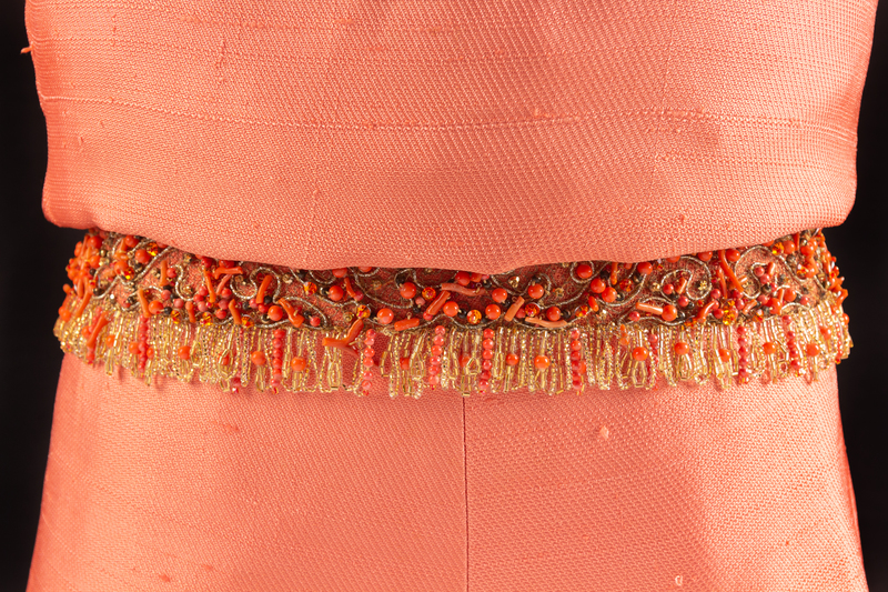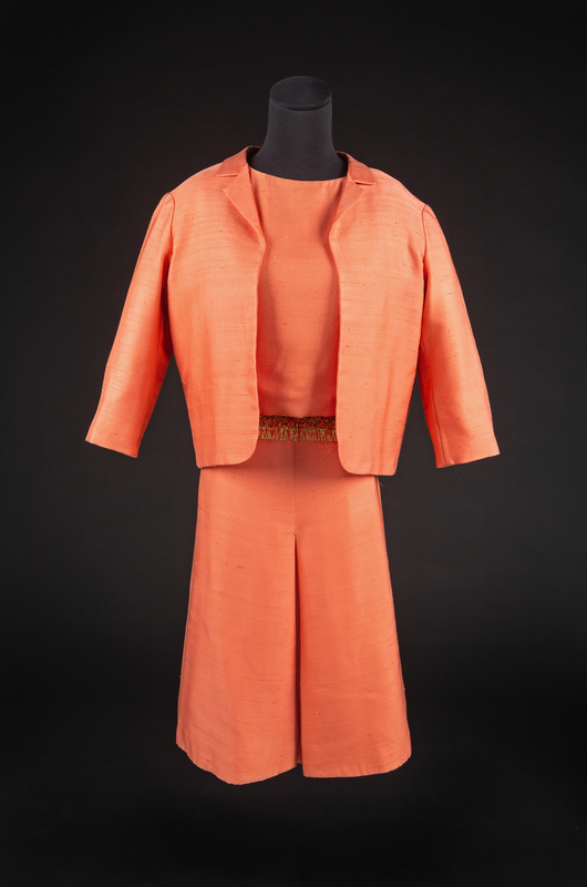 Ensemble consisting of jacket, dress, bodice, bag and belt of peach raw silk. The main seams of the ensemble are sewn by machine while the inside, finishing stitches are done by hand. The jacket has a notched collar, 3/4 length sleeves and hangs open down the center front with no closures. The sleeveless bodice has a scoop neckline, gathers into a tight waistband and closes down the center back with a zip. The bodice comes with two separate belts, which attach to the bodice with snaps. One belt is plain and made of self-fabric, the second is heavily embroidered with beads, sequins and gold thread. The dress is made of an a-line skirt with a box pleat down center front and is attached to a peach silk sleeveless blouse. The dress closes down the center back with a zip.