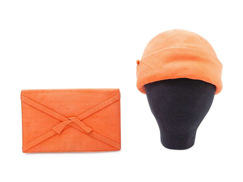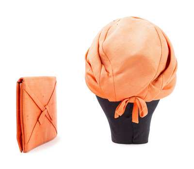 The bag and hat are made of the same material as the ensemble. The bag is a clutch style with no handle and one main flap decorated with a flat bow. The hat is self-fabric shaped into a gathered and fitted cap with a bow at the center back and an inner wire in the hem.