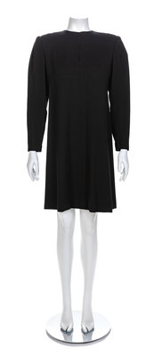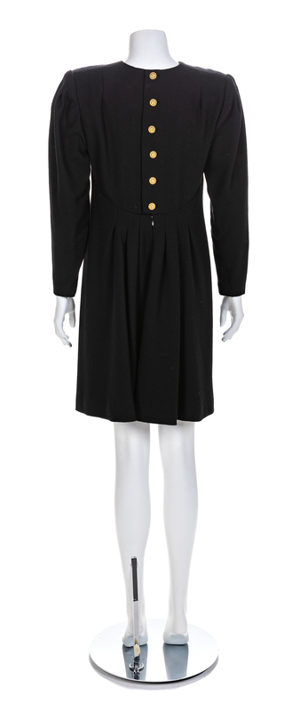 Black crepe dress with round neckline with keyhole, empire waistline, inverted pleat detail on shoulders, back details including a curved waistline with inverted pleats on skirt, back zip closure on skirt, goldtone button closure on bodice, black lining, and shoulder pads.
