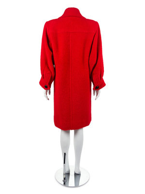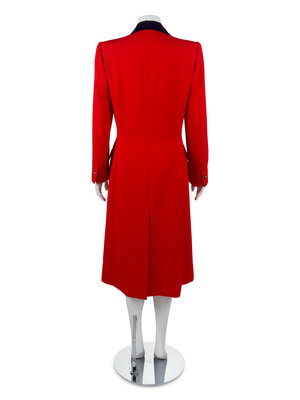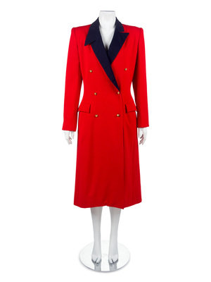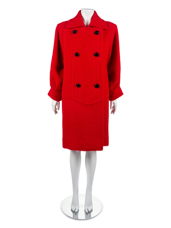 The first is a Givenchy red wool day coat with double-breasted front button closure, large black buttons, full cropped sleeves, side seam pockets, and red silk lining.