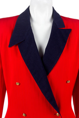 The second is a Bill Blass red striped silk coat with double-breasted front button closure, navy lapel, goldtone metal crest buttons, flap pockets, and vent at back hem.
