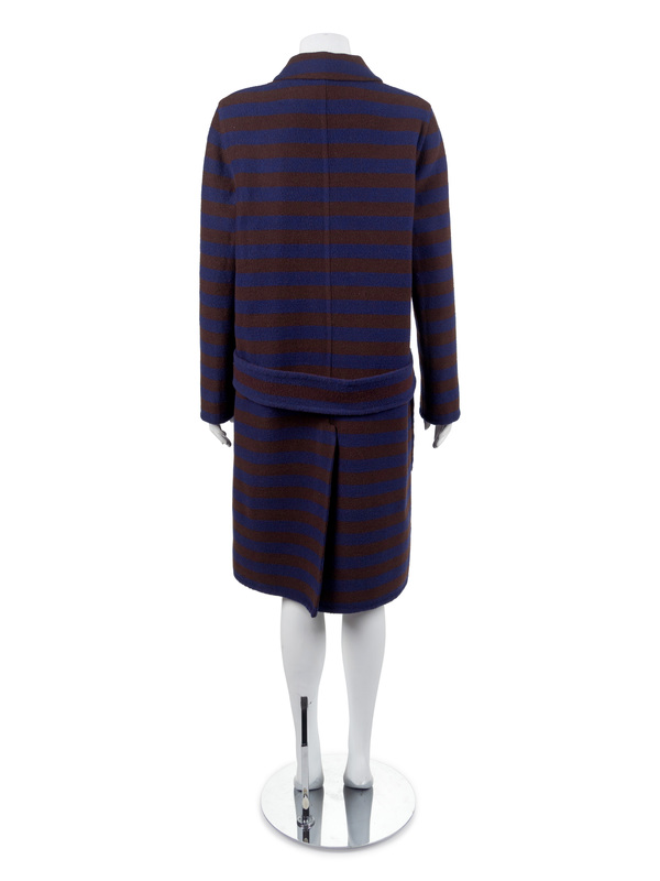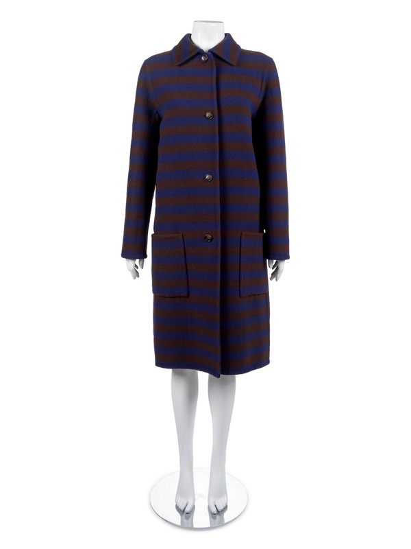 The third is a Bill Blass navy and brown striped wool coat with front button closure, patch pockets at hip, vent at back hem, back belt.